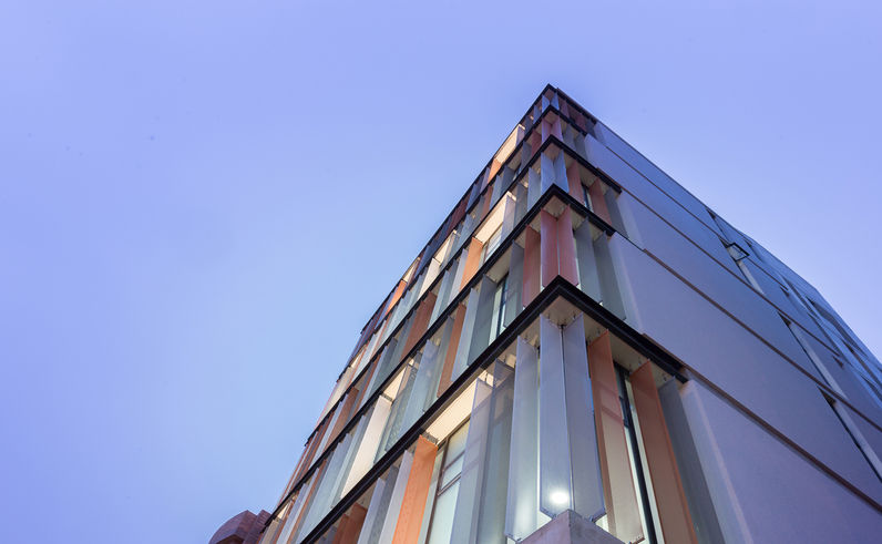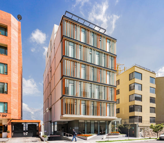 La subdivisión en retícula aleatoria de la fachada resuelve el problema de integración a un contexto en extremo heterogéneo tanto en escala como en recursos formales, permitiendo libertad en el juego de vanos y llenos sin afectar al resultado final de la composición. Para este efecto se recurrió a un software especializado en generar elementos paramétricos controlando de manera eficaz el comportamiento térmico del edificio, la calidad de iluminación y la expresión en fachadas. Este juego de vanos y llenos aleatorios se controló también paramétricamente en base a datos del contexto, permitiendo que la inserción del edificio no sea agresiva con el entorno y se integre de manera eficaz.