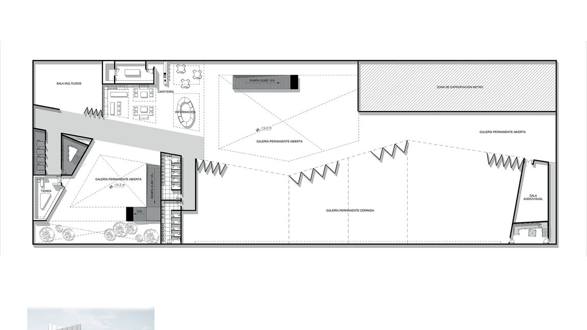 b) Accesos: El acceso principal está ubicado al norte del edificio y a través de un circuito de rampas que conectan todos los niveles, además de ser un espacio de exposición en si mismo. El acceso secundario se encuentra en el extremo sur, junto a la parada del metro que se incorpora
